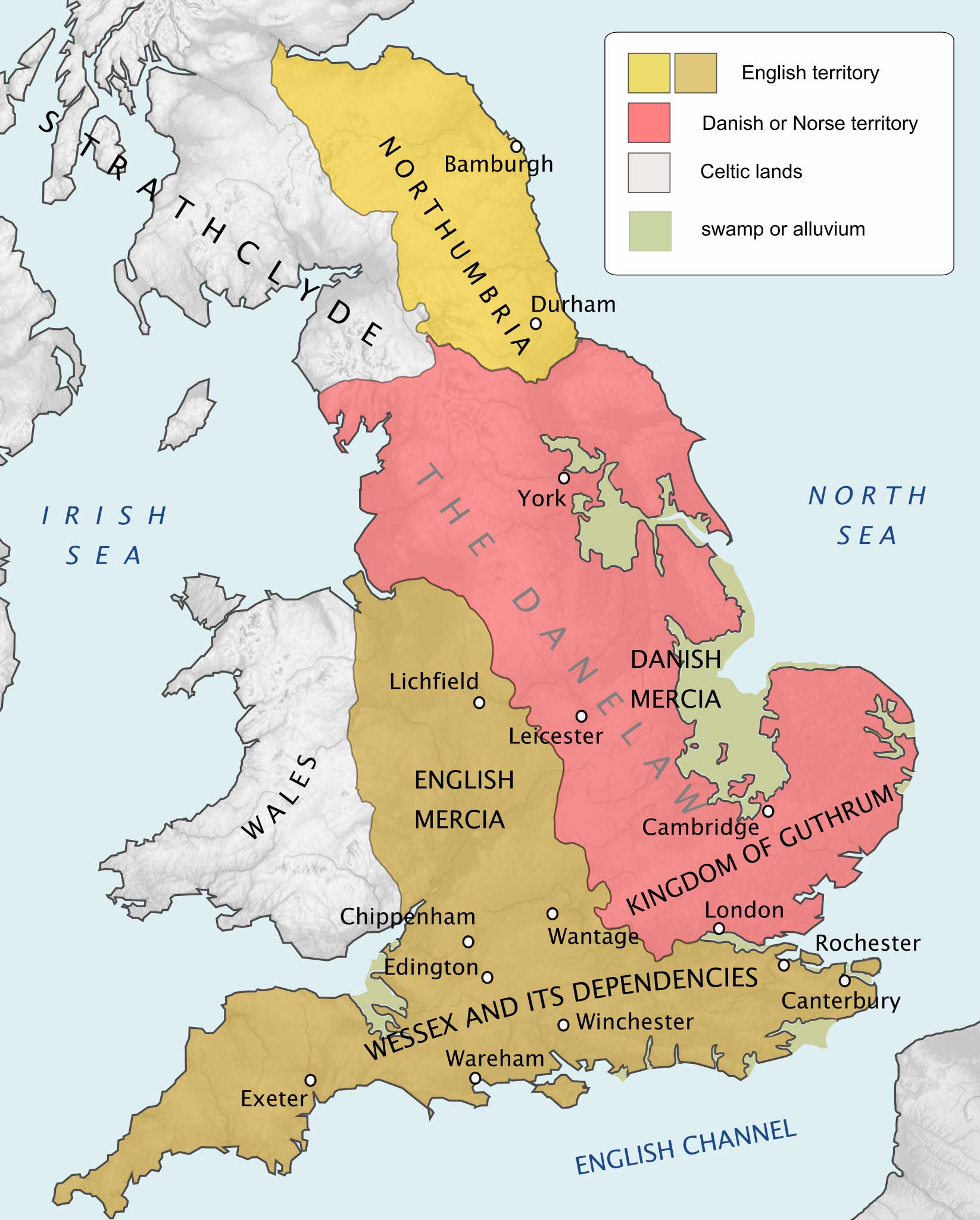 Only Wessex and Mercia held out against the Danish onslaught, and those only by the virtue of Alfred’s guile and force of will. He saw all Anglo-Saxons as one people, the Angelcynn, the English race. Together they withstood the Viking pressure, and began to push back. In 878, at the Battle of Edington, Alfred defeated the Viking king Guthrum, had him baptized under the Englisc name Aethelstan, and named him king of East Anglia.