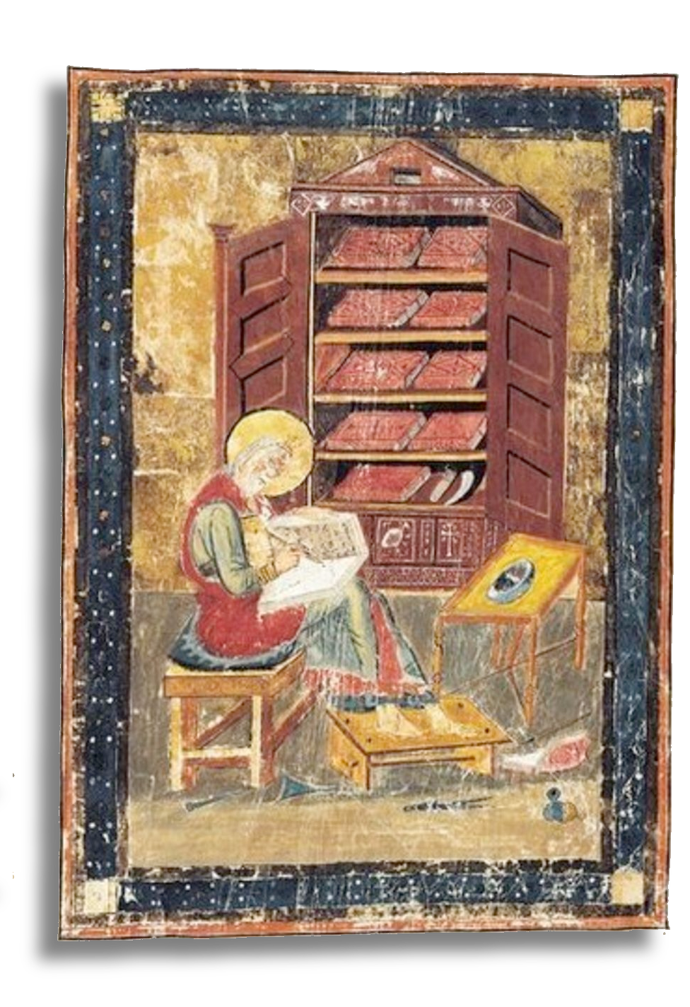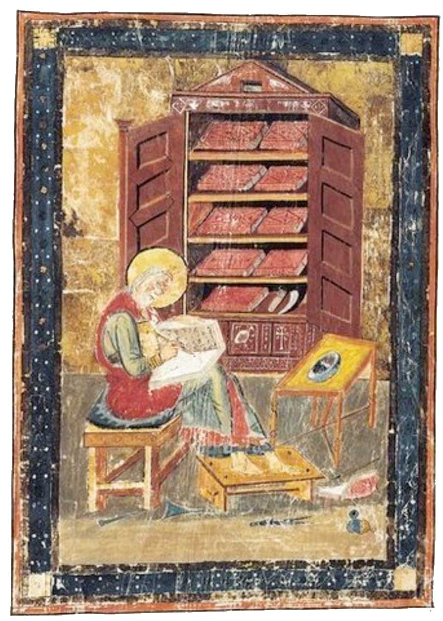 A thousand years ago, in the scriptorium of Wintanceaster's Old Minster, an anonymous scribe sat bent over a writing table, carefully replicating, word by word, a medieval folio, itself perhaps a hundred years old. Every step of the process required meticulous labor. Lamb-, kid- or calfskin vellums had to be soaked in urine to remove flesh and hair, then washed, scraped, stretched and dried before being cut into sheets and scored with parallel scratches to mark lines and margins. Black ink was manufactured from crushed oak galls, scarlet from red mercury and egg white, and green from malachite, all using gum arabic from African acacia trees as a stiffener and applied with quill pens. Wing feathers from geese or swans (the curvature of left-wing feathers being preferred by right-handed scribes) constantly needed their quills sharpened, up to sixty times a day. Each scribe kept a small knife ready in his off hand for that purpose, and to scrape away errors in transcription before the ink set on the skin. The work was slow, tedious, and exacting.
