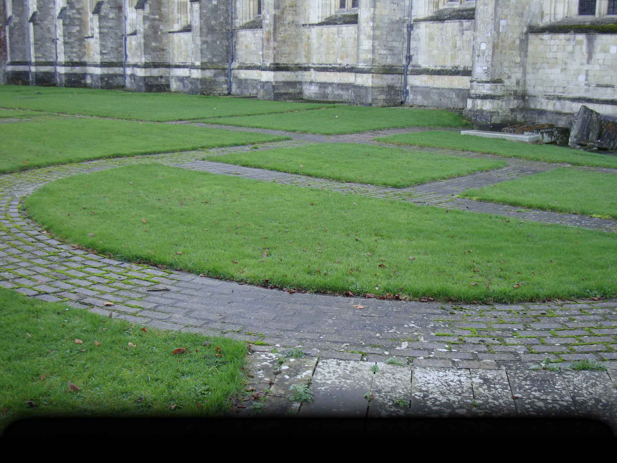oday the Cathedral Church of the Holy Trinity in Winchester, England is one of the largest cathedrals in Europe.*It has also inspired two pieces of modern popular music: “Winchester Cathedral” by The New Vaudeville Band, 1966 (No. 1 in the USA and Canada, No. 4 in the UK) and “Cathedral” by Crosby, Stills & Nash, 1977. Every year several hundred thousand visitors marvel at its architecture, a pastiche of styles from across the centuries of its construction: the Norman-style transepts, 75 feet high; the Early English-style retrochoir, built over a century later to house a shrine for Saint Swithun; and its late-Gothic nave, with spectacular vaults over 80 feet across, soaring almost as high. The church was built over the course of nearly 500 years, using hand tools to carve marble, honey-colored Bath stone, and limestone from as far away as the Isle of Wight and Normandy. Visitors wandering the outer grounds, craning their necks upward to admire the 150-foot Norman-era bell tower, might completely miss the odd brickwork paths beneath their feet: right angles and semicircles, leading nowhere.